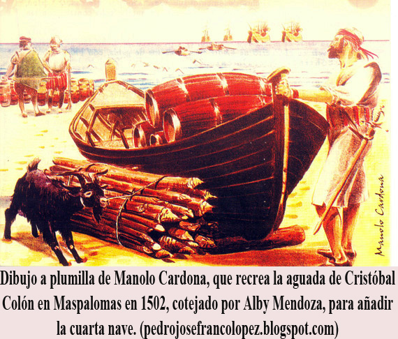 Por cierto, para esta última propuesta, el grancanario mago de la creatividad: Israel Reyes, ya realizó un Proyecto de espectáculo conmemorativo “Maspalomas: 1502/2002”, con motivo del V centenario del cuarto viaje de Colón y su paso por la zona. Para no variar, quedó en “agua de borrajas”, pero ahí queda el magnífico documento que aguarda a que se retome y cobren vida en las inmediaciones de la Charca, las Dunas, el Palmeral y las doradas Playas de un sinfín de tambores, bucios, pintaderas de simbología aborigen, estandartes de la conquista, monjes, navegantes y, por supuesto, el Globo terráqueo, Colón y su hijo Hernando.